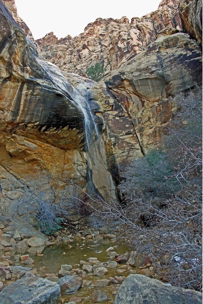 Lost Creek Waterfall is a small oasis tucked up against the cliffs, hidden by tall brush. It’s often dry, but even a small amount of rain will produce a 50ft waterfall.