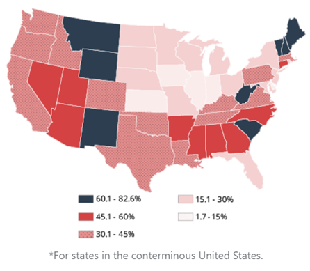 Figure 2: Percent of Houses in the WUI out of Total Houses in the State* (%) (U.S. Fire Administration, 2021)